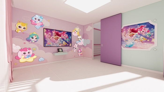 객실은 세 가지 유형이다. △포토존 중심으로 꾸민 프린세스룸 △티니핑 도감을 활용한 연구소룸 △시즌5를 재현한 슈팅스타룸이다.