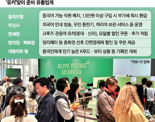 편의점 업계는 알리페이 등 중화권 고객이 선호하는 결제 수단 할인 프로모션을 펼친다. 편의점 업계 관계자는 "한류 붐으로 K푸드 인기가 대단하다"며 "한국인들이 먹는 과자나 음료에 관심이 많은 외국 손님을 위해 결제나 주문 등 쇼핑 편의를 개선·향상하는 데 공들였다"고 했다. 대형마트에서는 K푸드·뷰티 등을 선보이는 기획전을 준비하고 있다. 이와 함께 배달앱들도 중국 간편결제를 지원하며 유커를 겨냥하고 있다.