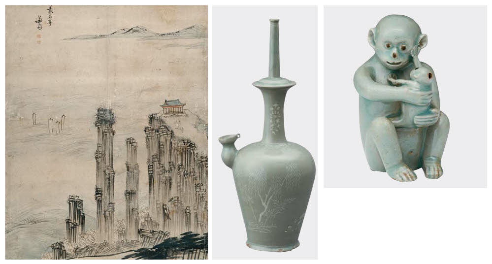 간송미술관 '보화비장'전에 선보이는 미술품들. 왼쪽부터 겸재 정선의 '금강산 8폭' 중 '총석정',12세기 작품인 '청자상감연지원앙문정병'(국보)와 청자모자원숭이형연적(국보). 간송미술문화재단