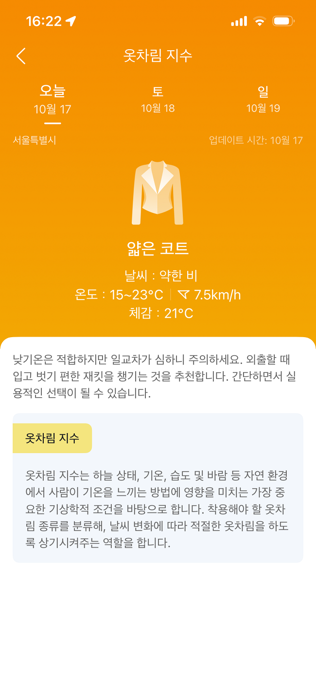 MojiWeather는 인터페이스를 설계함에 있어 한국 사용자의 사용 습관을 심층적으로 결합시켰다. 메인 화면은 간결하고 직관적이며 ‘현재 온도, 풍력, 습도 및 24시간 예보’ 등 핵심 정보를 디폴트로 표시하여 사용자는 복잡한 조작을 하지 않고도 빠르고 쉽게 날씨 데이터를 획득할 수 있으며, 이를 통해 시간을 절약하고 노력을 줄일 수 있다.