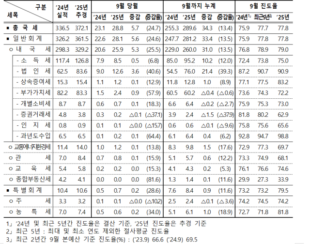다만 부가가치세 세입는 환급 증가로 지난해 동기 대비 1~9월 기준 4000억원 줄었고,증권거래세율 인하 효과로 증권거래세도 전년 동기 대비 1조5000억원 감소했다.