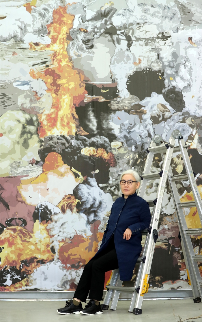 2019년 본지와 인터뷰 중 삼송 작업실에서 포즈를 취하고 있는 이불. <한주형기자>