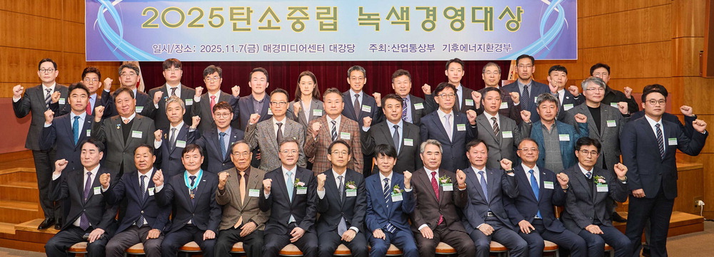 녹색경영 모범 기업과 유공자를 포상하는 '2025 대한민국녹색경영대상' 시상식이 7일 서울 중구 매경미디어센터에서 열렸다. 산업통상부와 기후에너지환경부가 주최하고 매경안전환경연구원이 주관하는 이날 행사에서 대통령 표창 2점,국무총리 표창 3점,산업통상부 장관 12점과 유공자 부문 15명,특별상 부문 2점에 대한 시상이 이뤄졌다. 앞줄 왼쪽부터 박근종 성북구 도시관리공단 이사장,김희곤 선일이씨티 대표,이영기 한국남동발전 부사장,공창석 매경안전환경연구원 원장,위정환 매일경제신문 대표,강감찬 산업부 실장,안세창 기후부 실장,김덕현 심사위원장,이정복 한국서부발전 사장,김두환 수도권매립지관리공사 본부장,박현규 한국환경공단 실장. 김호영 기자