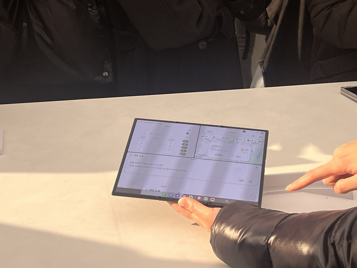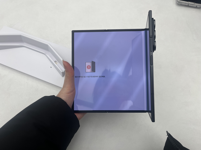 접는 순서를 잘못하면 진동과 함께 “다른 쪽부터 열어달라”는 알림 메시지가 화면에 나타난다. [안서진 기자] 예를 들어 접는 순서를 잘못하면 진동과 함께 “다른 쪽부터 열어달라”는 알림 메시지가 화면에 나타나 실수를 곧바로 알 수 있게 한다. 이런 안전장치는 생소한 3단 폴더블 경험을 좀 더 자연스럽고 감각적으로 느끼게 만드는 데 큰 역할을 한다.