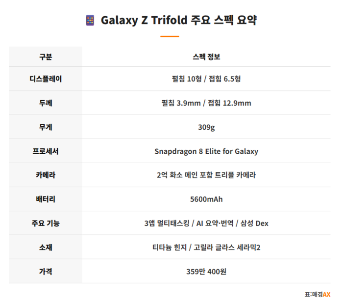 최근 출시한 갤럭시 Z 트라이폴드는 3단 접이식 인폴딩 구조를 적용해 펼쳤을 때 10형 대화면과 접었을 때 6.5형 커버 디스플레이를 구현하며,두께는 각각 3.9mm와 12.9mm로 슬림한 편입니다. 티타늄 힌지와 고릴라 글라스 세라믹2를 적용해 내구성을 높였고,퀄컴 스냅드래곤 8 엘리트 모바일 플랫폼을 탑재했습니다. 2억 화소 메인 카메라를 포함한 트리플 카메라와 5600mAh 배터리를 장착해 전문가급 촬영과 긴 사용 시간을 지원합니다.