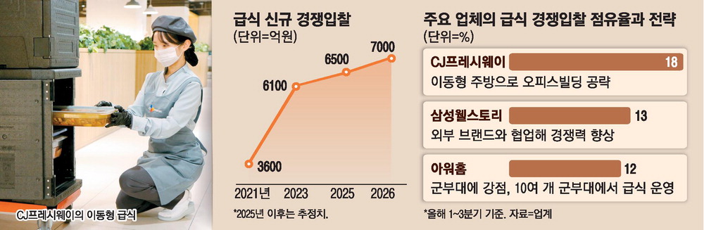 올해 1~3분기 경쟁입찰시장 점유율의 경우 CJ프레시웨이(18%),삼성웰스토리(13%),아워홈(12%) 순으로 3강 구도를 이루고 있다.