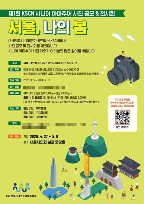 이번 공모&전시회는 ‘서울,나의 봄’을 주제로 2026년 서울의 봄을 담은 사진작품을 모집한다. 공모 기간은 5일부터 4월 10일까지이며,선정된 우수작은 4월 27일부터 5월 8일까지 서울시의회 중앙홀에서 전시될 예정이다.