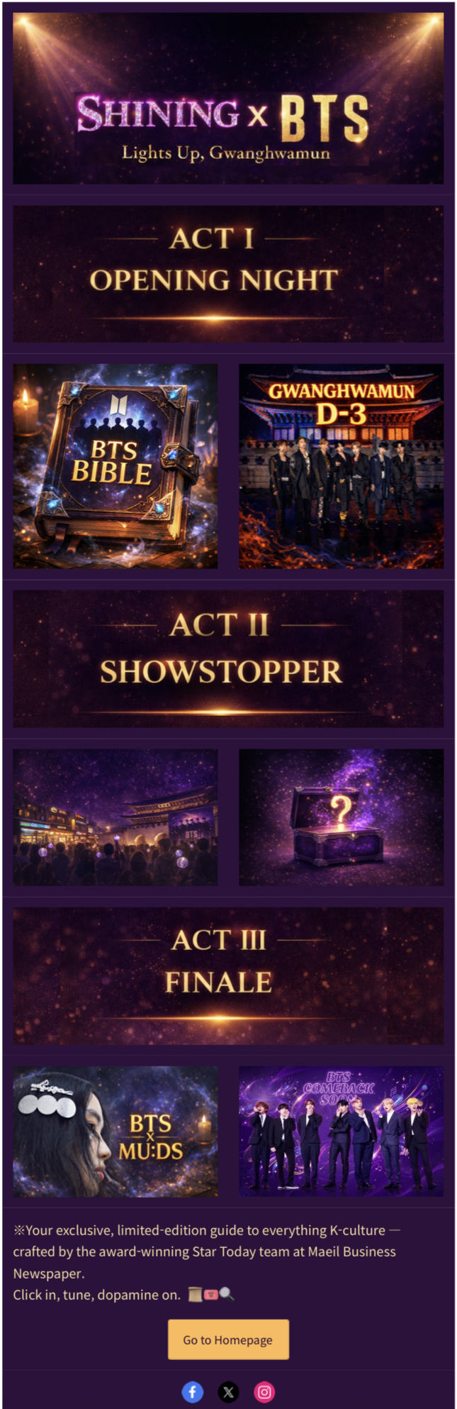 방탄소년단(BTS) 컴백에 맞춰 매일경제 스타투데이의 글로벌 AI 뉴스레터 ‘SHINING’ 특별판이 발행됐다. 지난 18일 발행된 특별판은 군복무로 인한 그룹활동 공백기 동안 솔로 활동으로 빌보드 ‘핫 100’ 1위를 기록한 멤버들의 성과를 되짚고,RM과 정국의 컴백 준비 과정과 성장 스토리까지 세밀하게 분석했다. 서울 전역을 거대한 문화 체험 공간으로 만드는 ‘더 시티 아리랑 서울’ 프로젝트와 숭례문·서울타워를 활용한 미디어 파사드 전략도 상세히 소개했다. 오는 23일 발행 예정인 특별판 2호에서는 광화문 컴백 무대를 실시간 조명하고,현장을 직접 관람한 팬들의 생생한 경험까지 담아낼 계획이다. 뉴스레터는 별도 가입 없이 홈페이지(https://kstarletter.stibee.com)에서 이메일 입력만으로 구독 가능하다.