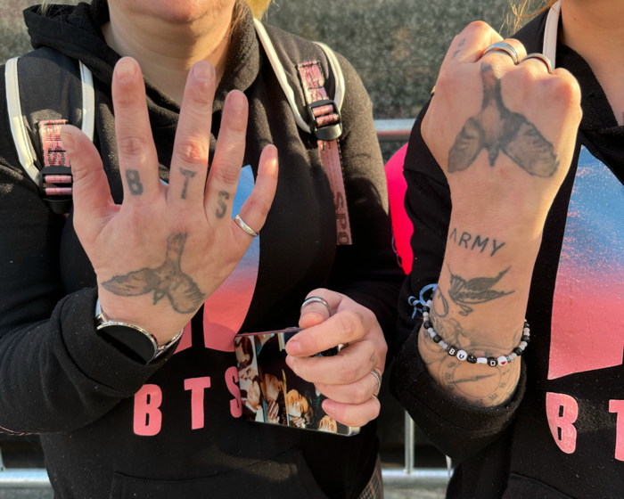 방탄소년단(BTS)이 지난 21일 서울 광화문광장에서 새 앨범 발매를 기념해 ‘BTS 컴백 라이브: 아리랑’ 컴백 공연을 하고 있다. 사진공동취재단 팬들은 국적도 사연도 제각각이었다. 독일에서 온 마렌(40)·멜리사(40)는 쌍둥이 자매 아미다. BTS 로고가 있는 옷을 함께 맞춰 입고 손등에 ‘BTS’와 ‘ARMY’ 타투를 새긴 그들은 이날 오전 9시부터 광화문 일대에 자리를 잡았다. 이들은 “2019년부터 함께 BTS의 팬이 됐다”며 “콘서트 일정을 확인하고 곧바로 여행 일정을 잡았다”고 말했다.