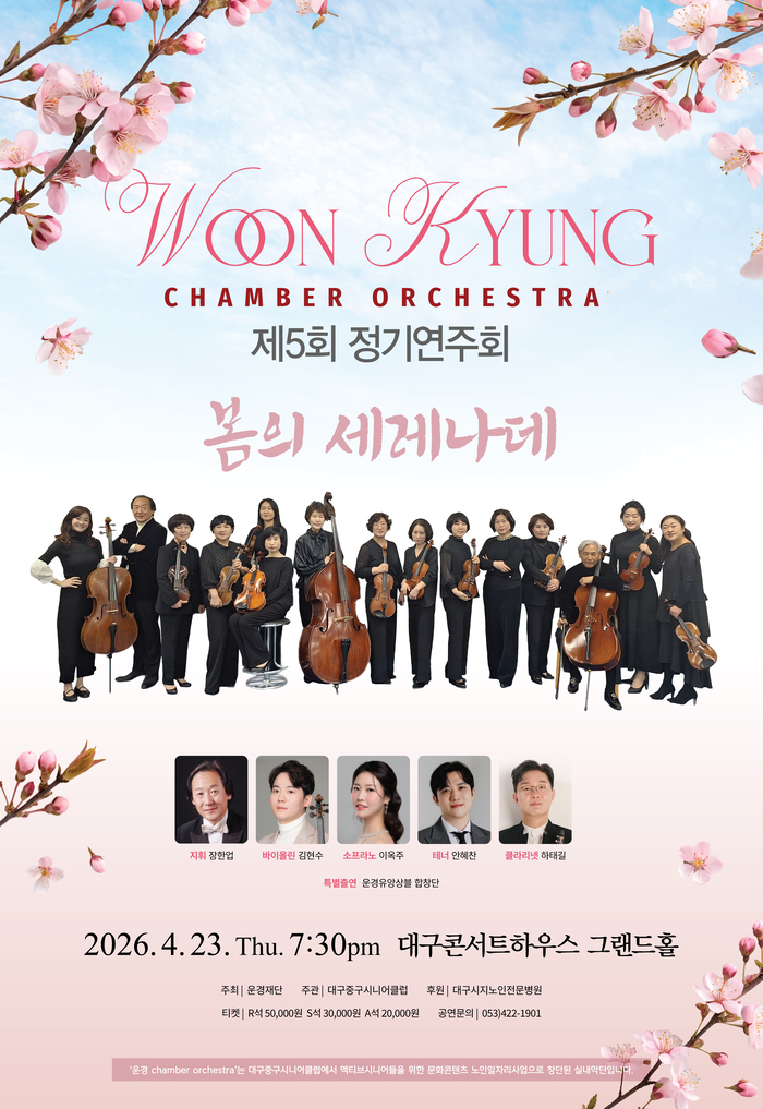운경 챔버 오케스트라 ‘제5회 정기연주회’ 포스터 [운경재단] 운경재단(이사장 곽재훈) 대구중구시니어클럽은 대구콘서트하우스에서 운경 챔버 오케스트라 ‘제5회 정기연주회’를 개최한다고 1일 밝혔다.