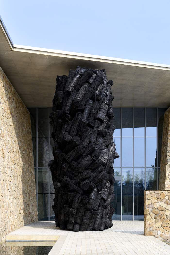 뮤지엄산 입구에 설치된 이배의 ‘불로부터’ <뮤지엄산> 8m 높이의 거대한 숯 기둥이 관람객의 동선을 가로막는다. 뮤지엄 산 입구에서 세워진 이 설치 작품은 2022년 강릉 산불 이후 작가가 마주한 공포,그리고 재해를 극복하려는 염원을 형상화한 결과다. ‘숯의 작가’ 이배(70)가 30년 넘게 천착해온 숯은 자연의 순환을 넘어 재앙과 치유에 대한 질문으로 확장된다.