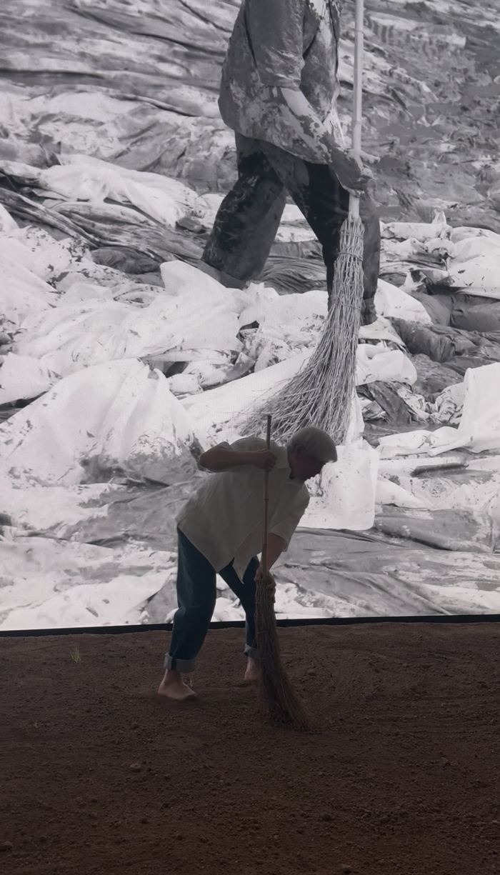작가는 고향의 흙을 전시장에 옮겼다. 그 앞에는 작가가 붓질을 하듯 고향 땅에서 빗자루질을 반복하는 퍼포먼스 영상이 상영된다. 지난 6일 열린 간담회에서 그는 “빗자루로 흙을 쓰는 일과 그림 그리는 일은 다르지 않다”며 직접 퍼포먼스를 선보였다.