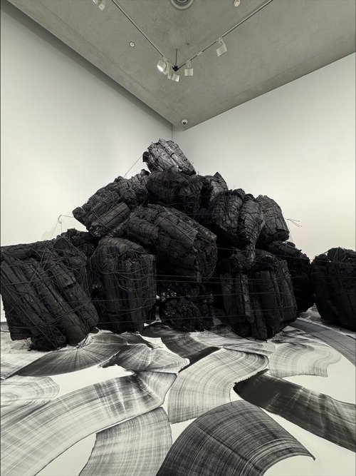 8m 높이의 거대한 숯 기둥이 관람객의 동선을 가로막는다. 뮤지엄산 입구에 세워진 이 설치 작품은 2022년 강릉 산불 이후 작가가 마주한 공포,그리고 재해를 극복하려는 염원을 형상화한 결과다. '숯의 작가' 이배(70)가 30년 넘게 천착해온 숯은 자연의 순환을 넘어 재앙과 치유에 대한 질문으로 확장된다.