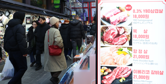 1년새 외식물가가 줄인상하고 있는 가운데 서울 중구 명동의 한 식당앞에 가격이 안내돼 있다. [이승환기자] 중동 전쟁이 한 달 넘게 이어지는 가운데 유가 상승분이 본격 반영되는 이달부터 여행비·외식비 등 서비스 물가가 상승할 전망이다.