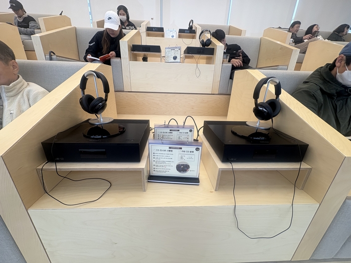 북스텝에서 CD로 음악 감상을 할 수 있다./사진=김지은 여행+ 기자 특히 헤드셋을 착용하고 원하는 CD를 들을 수 있는 콘텐츠는 개장 전부터 주민들의 기대를 모았다. 현재 음반 CD 기부 이벤트도 진행 중이며 음악분수는 오는 5월부터 운영될 예정이다. 북스텝에 앉아 시간을 보낸 한 방문객은 “통창으로 보이는 우이천 풍경이 너무 예쁘다”며 “우리 동네에 이런 공간이 생겨서 좋다. 동네 친구들 모임으로도 자주 올 것 같다”고 말했다.