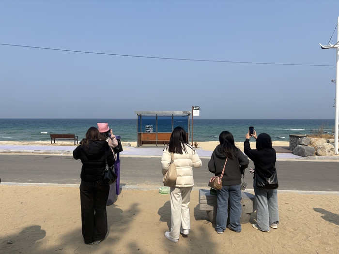 현장은 푸른 바다를 배경으로 버스정류장에 앉아 인증사진을 남기는 팬들로 북적였다. 멤버와 같은 포즈를 짓거나 방탄소년단의 핸드사인을 한다. 혼자 오는 여행객을 위한 카메라 거치대도 마련돼 있다.