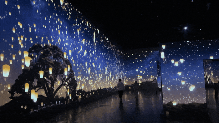 손을 더듬어 앞으로 나아가야할 정도로 조도가 낮은 입구를 지나면 강렬히 빛나는 미디어 아트 전시공간이 펼쳐진다. 1500평의 공간에 사방을 거울로 구성해 실제보다 훨씬 넓고 비현실적인 공간감을 만든다.